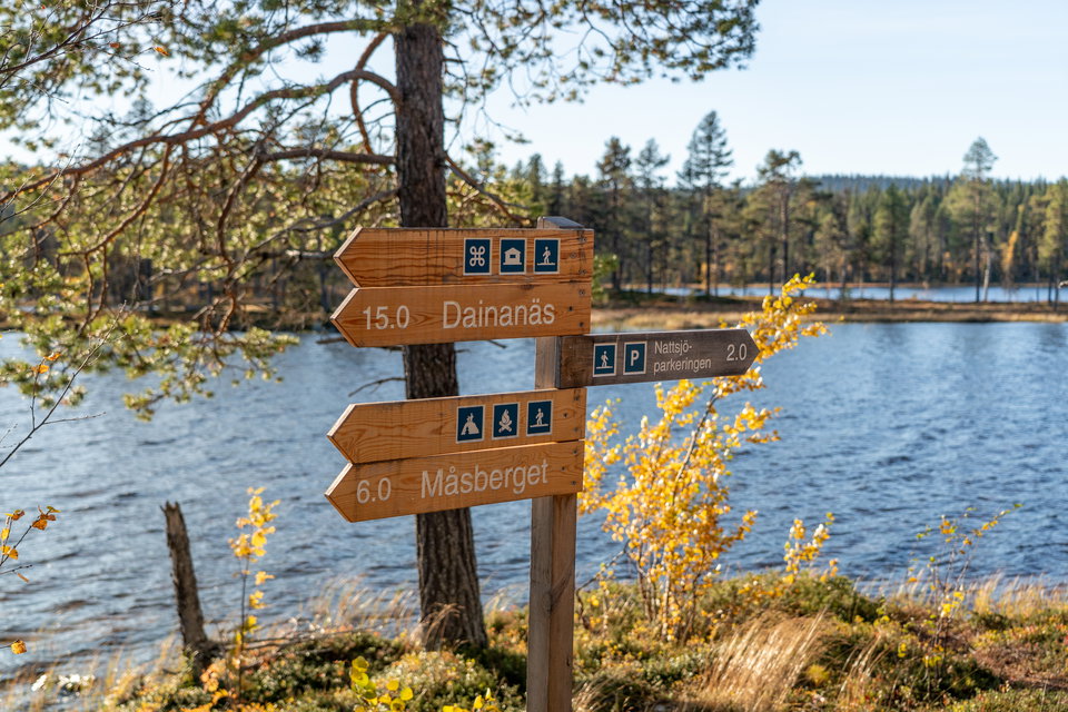 Härifrån till Dainanäs är det 12 km genom djup granskog och öppna kärr. Terrängen är krävande. Under vandringen är ett fikastopp uppe vid rastplatsen på Måsberget (670 meter över havet) en bra idé. Platsen ger en fantastisk utsikt över skogslandskapet och ända in mot snöklädda Marsfjällstoppar.