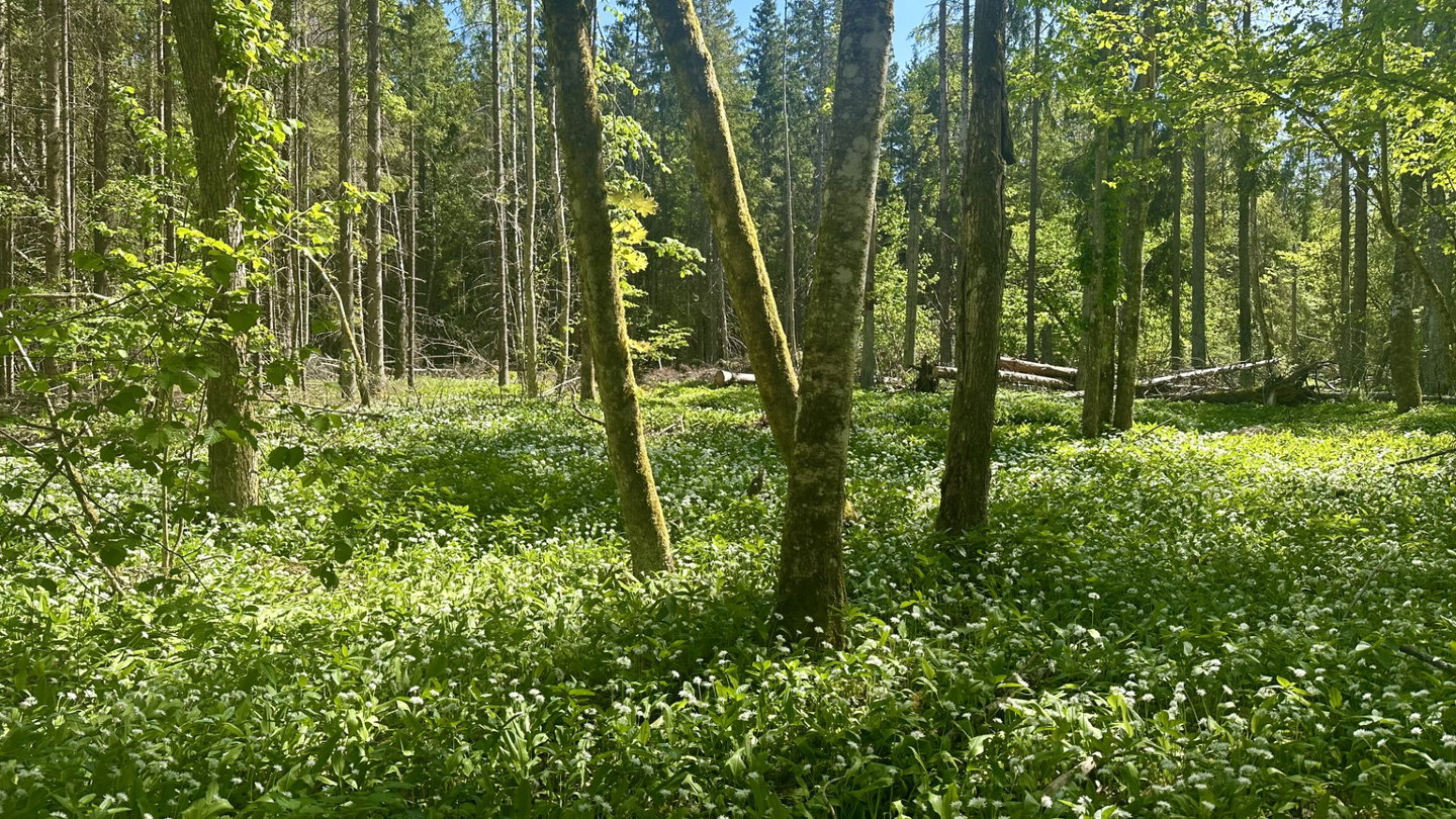 I sydvästra delen av reservatet finns en lummig och varierad lövskog med ek, ask, alm och lind. Försommarens vita blomning av ramslök ersätts senare av skogsbingeln.