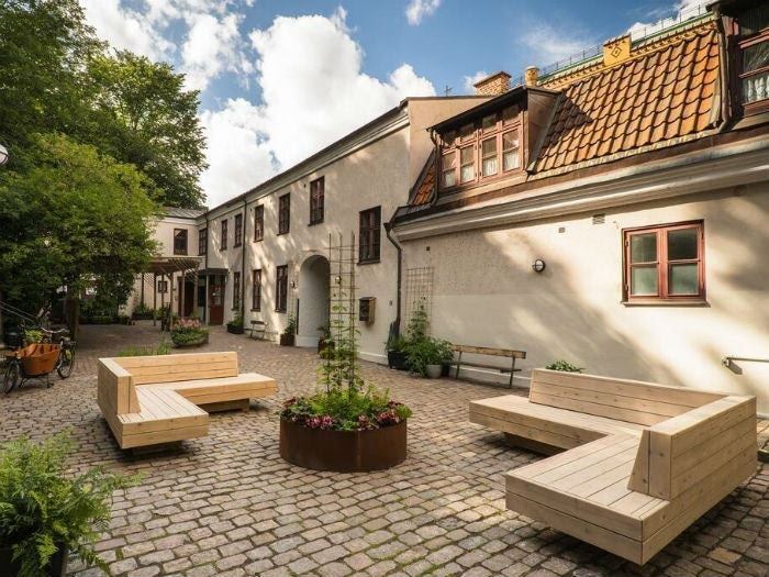 Vi serverar frukostbuffé med nygräddad bröd varje dag. Husets solsida har en grön utegård för lek och avkoppling skyddad från stadens brus.